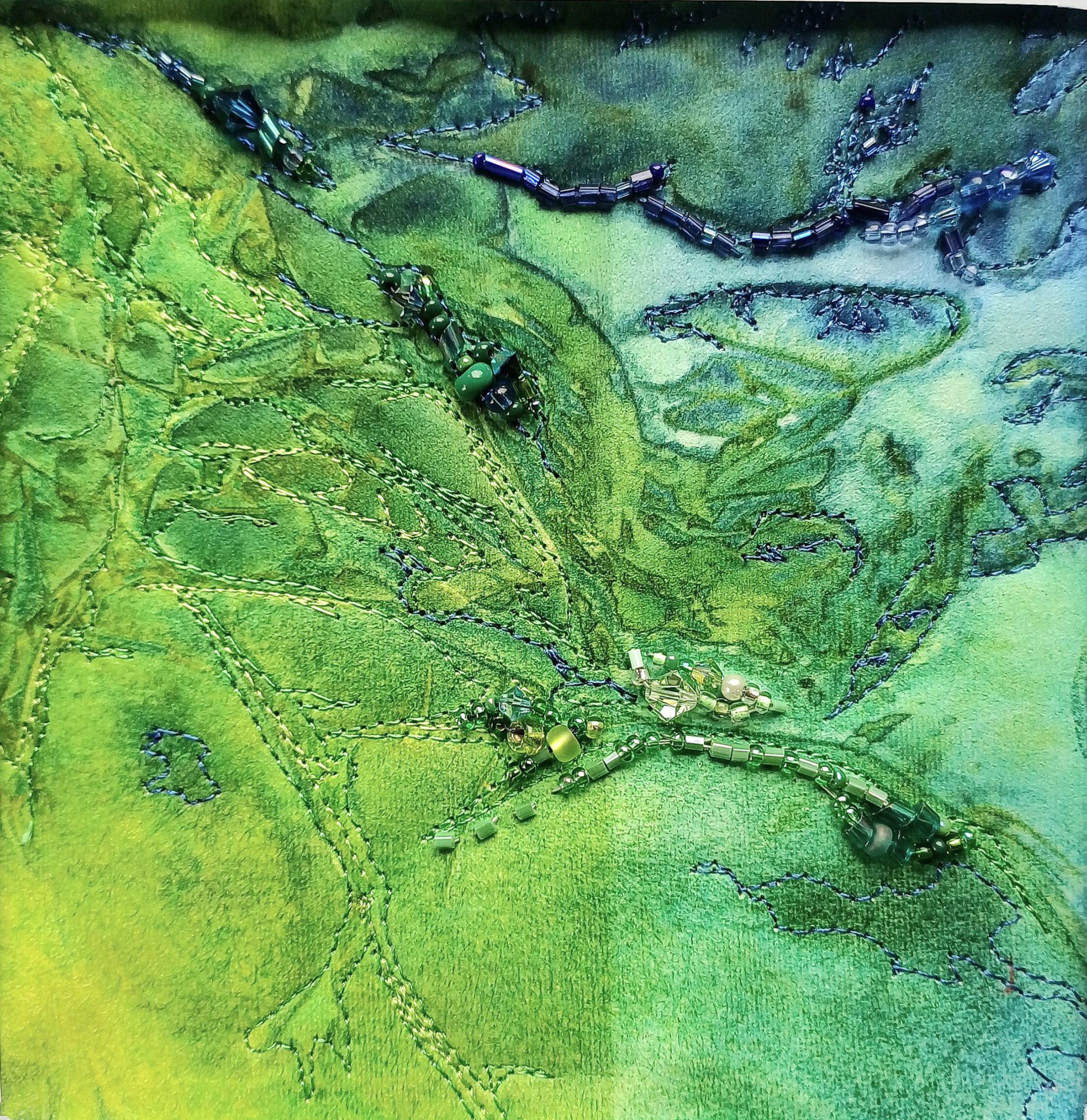 Organische Formen und Perlen in Blau und Grün mit fließenden Übergängen.