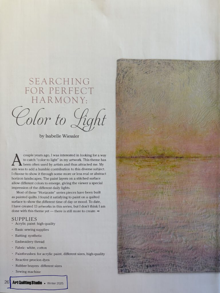 "Isabelle hat ein ausgeprägtes Auge für Details. Dies zeigt sich in ihren Mixed-Media-Arbeiten, in denen Oberflächenbearbeitung und aufwendige Nähte die reichen Texturen der Natur nachbilden. Ihre Werke sind hervorragende Beispiele dafür, was ein Art Quilt sein kann. Ein Mittel zum persönlichen Ausdruck mit einem starken Gespür für Quilttradition und -erbe."