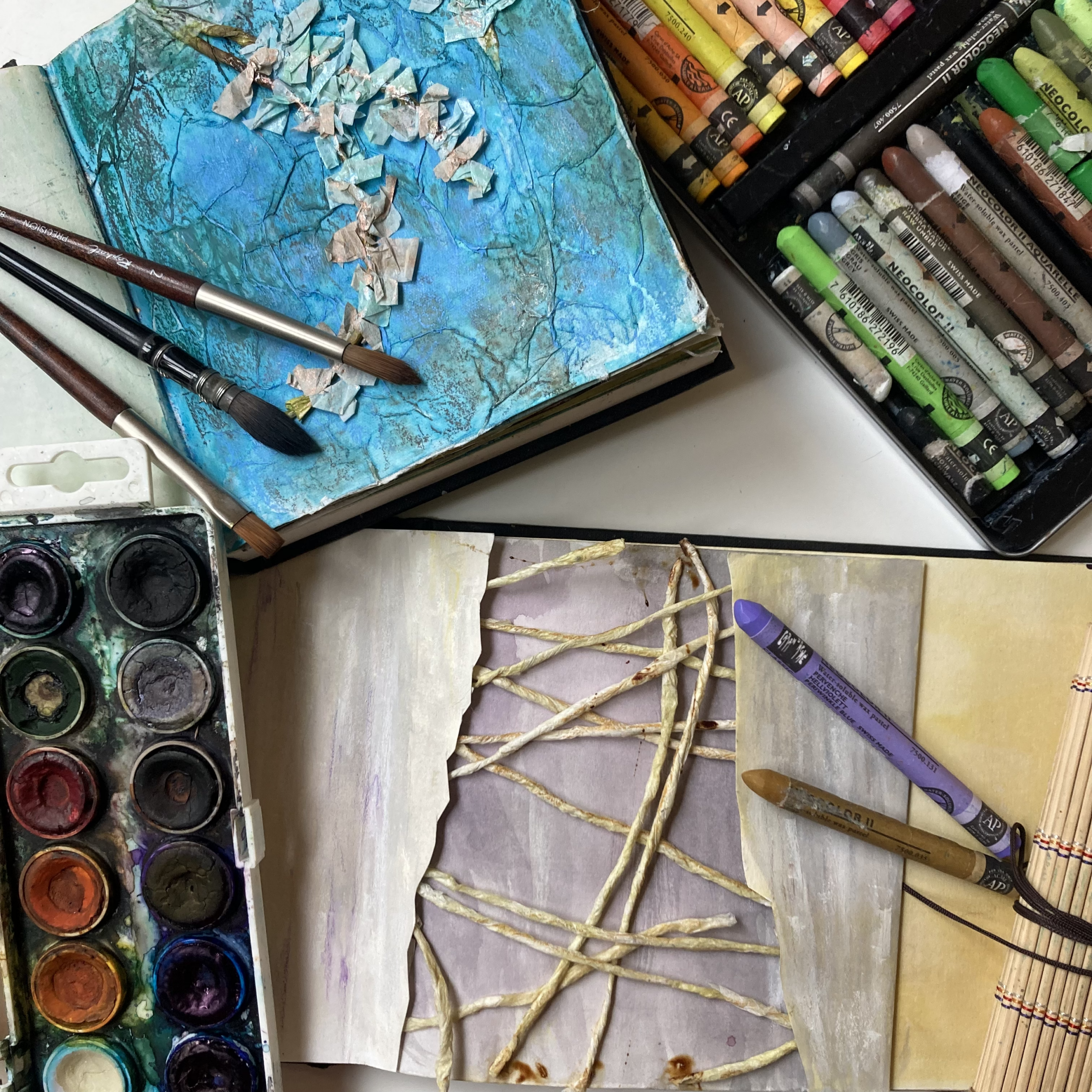Künstlerischer Arbeitsprozess mit Farben und Materialien auf Tisch.